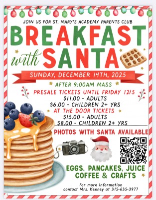 Breakfast with Santa!December 14, 2025St. Mary's Academy - BaldwinsvilleCome have a delicious breakfast with Santa! There will be pancakes with homemade maple syrup, eggs, juice, coffee and crafts! Click here for discounted presale tickets! But walk ins are welcome! Come and support St. Mary's Academy! ...