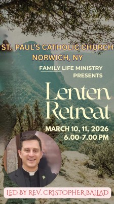 Lenten RetreatMarch 11, 2026St. Paul Church - NorwichAs we continue our Lenten journey of prayer, repentance, and renewal, you are warmly invited to our Lenten Retreat at St. Paul’s Catholic Church, New York, o followed by 20 minutes of Eucharistic Exposition each evening.Please mark your calendars a ...