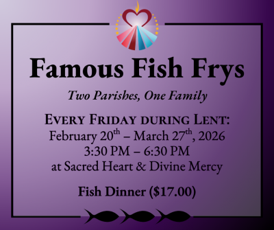 Fish Frys at our Two Parishes, One FamilyFebruary 20, 2026Sacred Heart ChurchFamous Fish Frys - Two Parishes, One FamilyEvery Friday during Lent: at Sacred Heart (Cicero) & Divine Mercy (Central Square)Fish Dinner ($17.00)Take out or dine in. Drive-thru (cash only).Complete menus are available on our website, www.sh-dm.org a ...