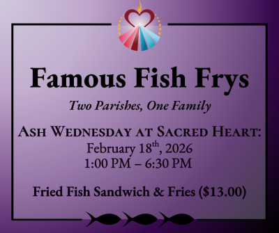 Ash Wednesday Fish FryFebruary 18, 2026Sacred Heart ChurchFamous Fish Frys - Two Parishes, One FamilyAsh Wednesday at Sacred HeartBeginning immediately following the noon Mass.Fried Fish Sandwich & Fries ($13.00)Take out or dine in.Complete menus are available on our website, www.sh-dm.org and at our paris ...