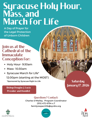 Mass & Holy Hour for Life with Bishop LuciaJanuary 17, 2026Cathedral of the Immaculate ConceptionSyracuse Holy Hour, Mass, and March for Life: a day of prayer for the legal protection of unborn children. Join us Saturday January 17th, 2026 at the Cathedral of the Immaculate Conception for: Holy Hour- 9:30amMass-10:30amSyracuse March fo ...
