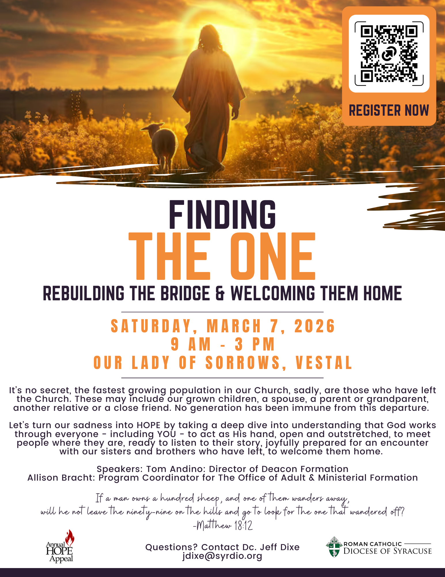Finding The OneMarch 7, 2026Our Lady of SorrowsLet's turn our sadness into HOPE by taking a deep dive into understanding that God works through everyone - including YOU - to act as His hand, open and outstreched, to meet people where they are, ready to listen to their story, joyfully prepared for ...